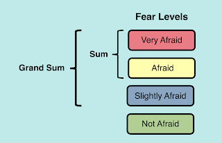 Another way to report the results is with the percentages for Slightly Afraid also added, to produce a Grand Sum, as shown above. This produces larger, scarier numbers for marketing purposes (but is slightly silly for including that possibly insignificant fear level).